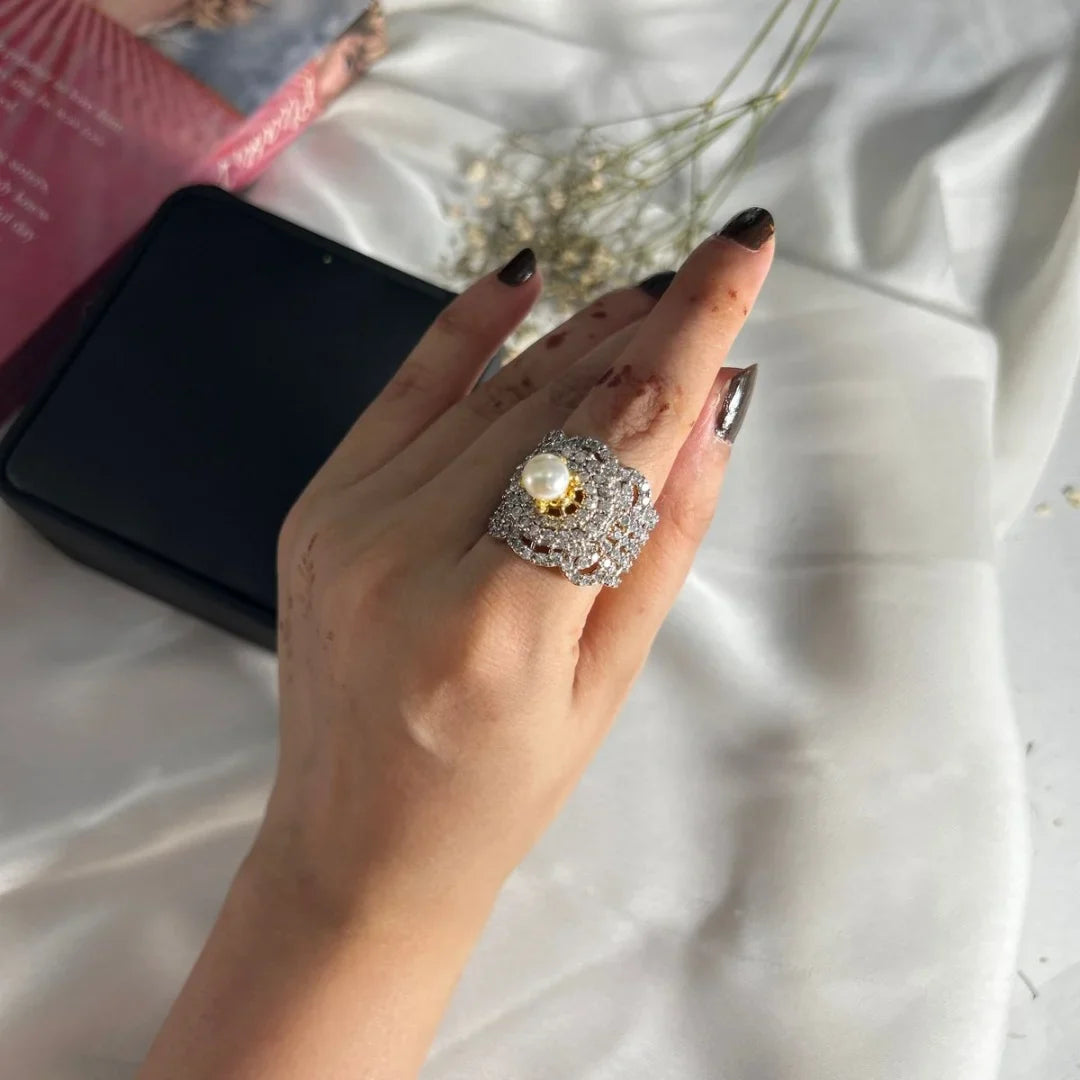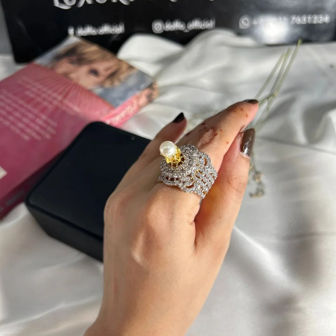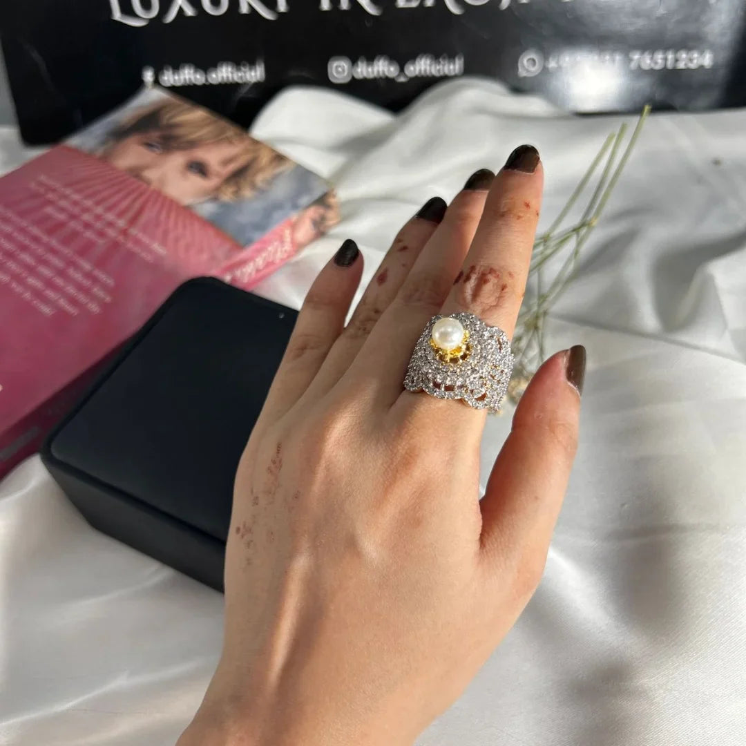 "An exquisite jarao-style gold-plated ring adorned with shimmering silver stones, crowned with a lustrous pearl at the top. Fully adjustable for a perfect fit, this regal piece combines timeless elegance with luxurious craftsmanship – a true statement for any occasion."