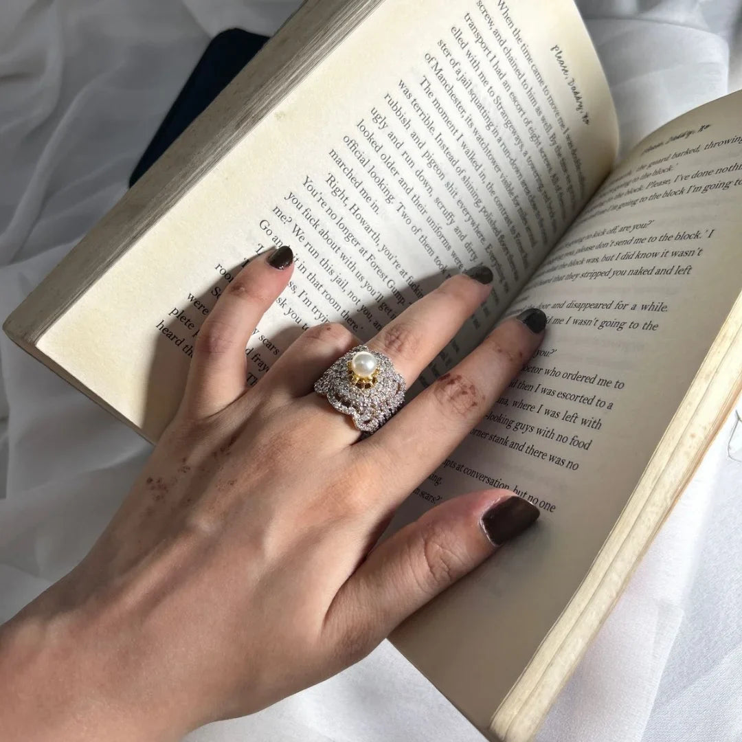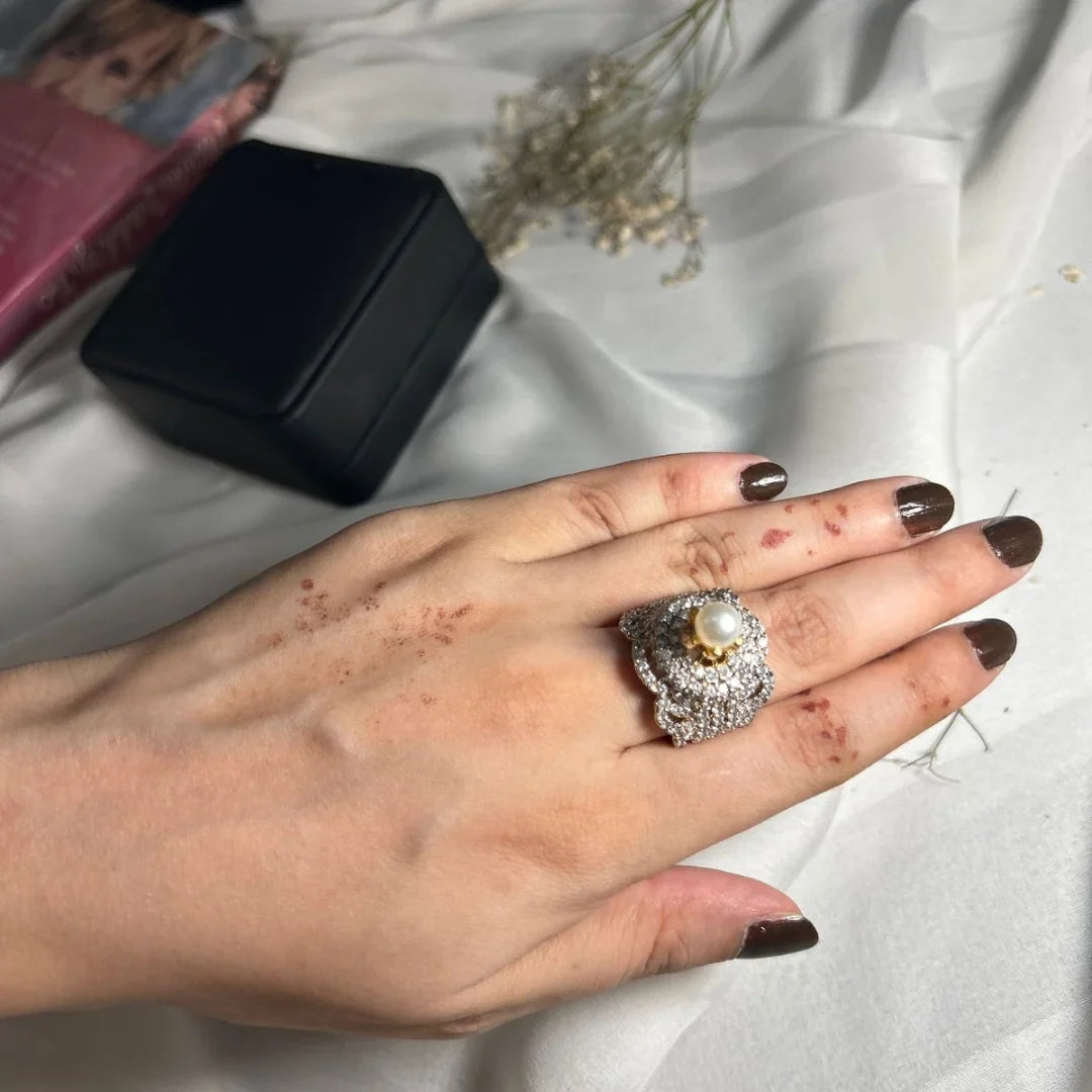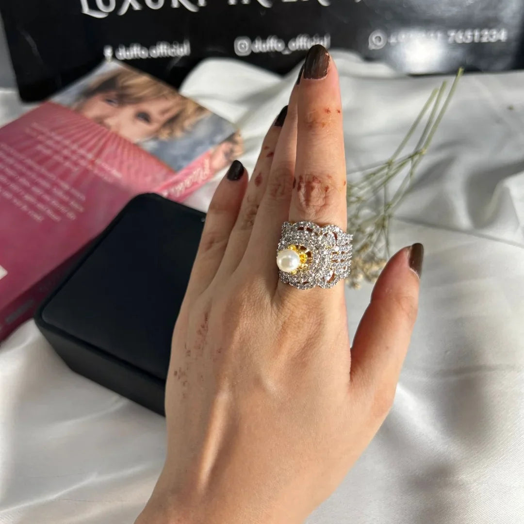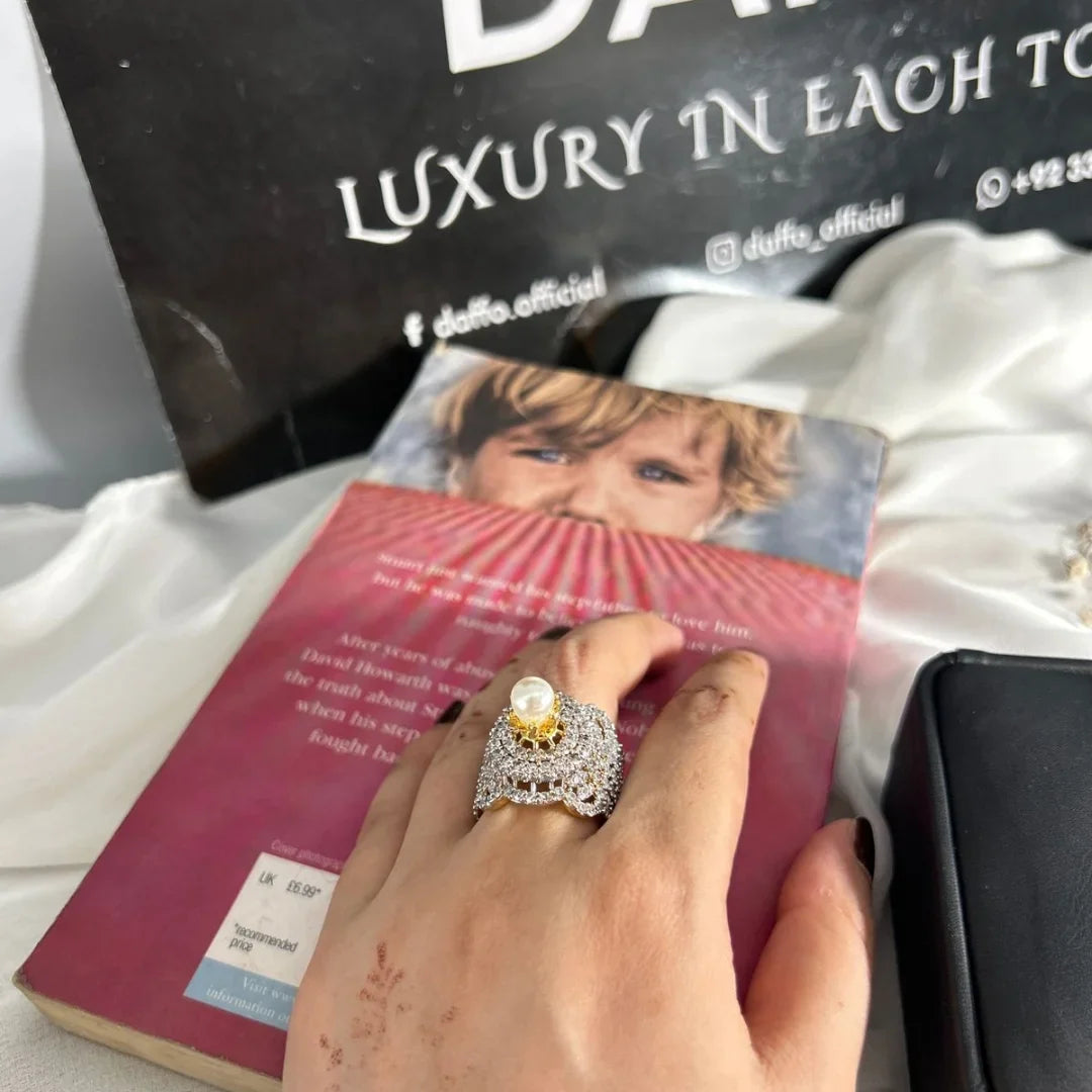 "An exquisite jarao-style gold-plated ring adorned with shimmering silver stones, crowned with a lustrous pearl at the top. Fully adjustable for a perfect fit, this regal piece combines timeless elegance with luxurious craftsmanship – a true statement for any occasion."