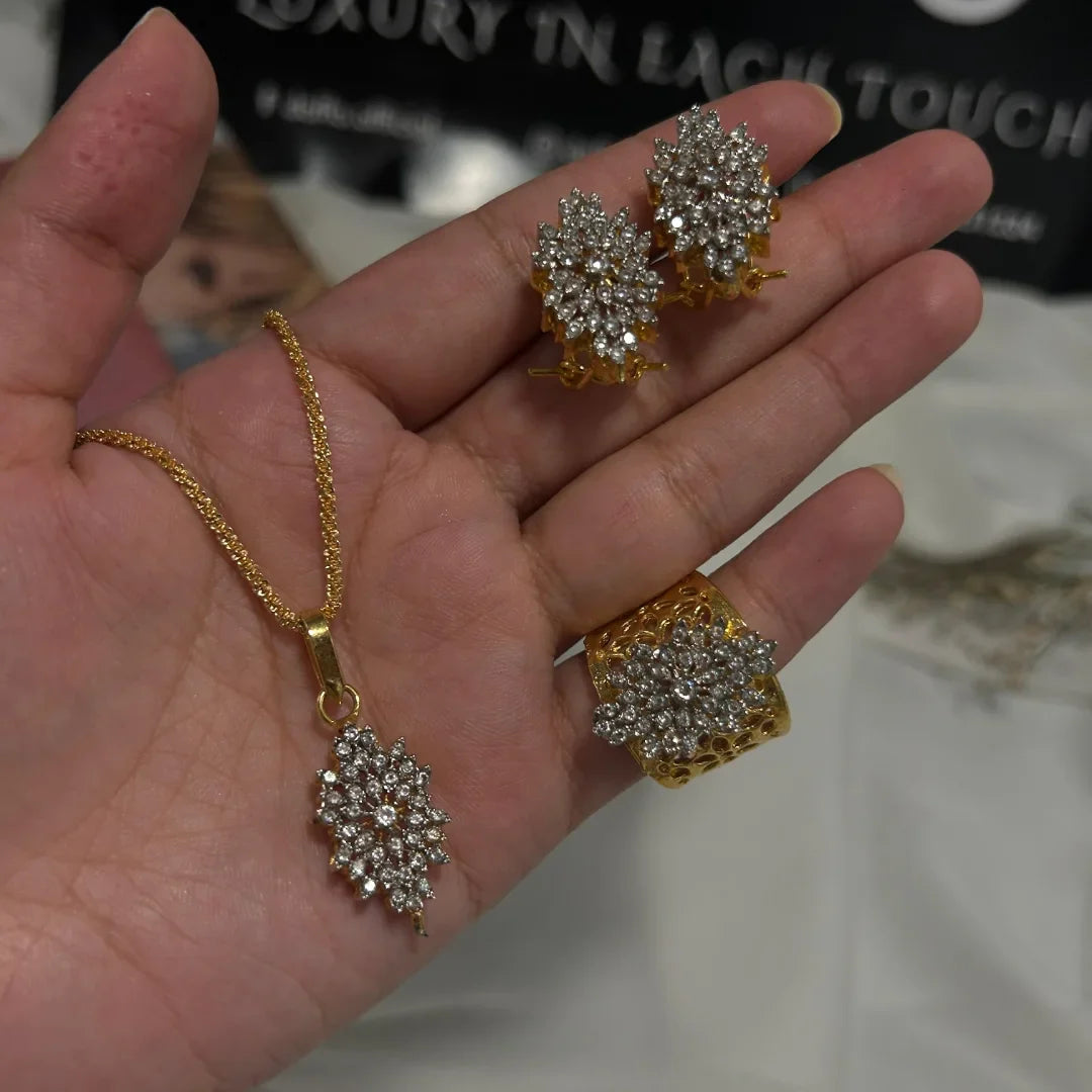 Add timeless radiance to your collection with the Lustre Bloom combo set — a gold design brought to life with sparkling silver zircon work. This elegant set is perfect for both special occasions and refined daily wear.