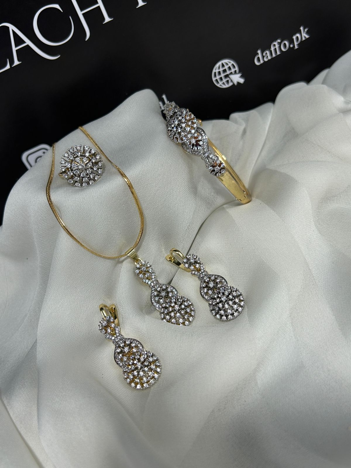 Shine with regal elegance in Zauviaa’s Radiance Royale Set, a 4-piece diamond-style ensemble featuring a sparkling openable bangle in standard size 2.6–2.8, matching earrings, a statement ring, and a graceful pendant. Perfect for weddings, formal events, or adding timeless glamour to your collection.