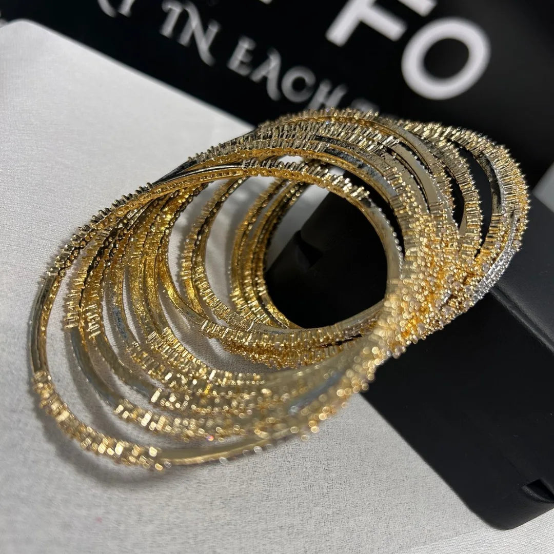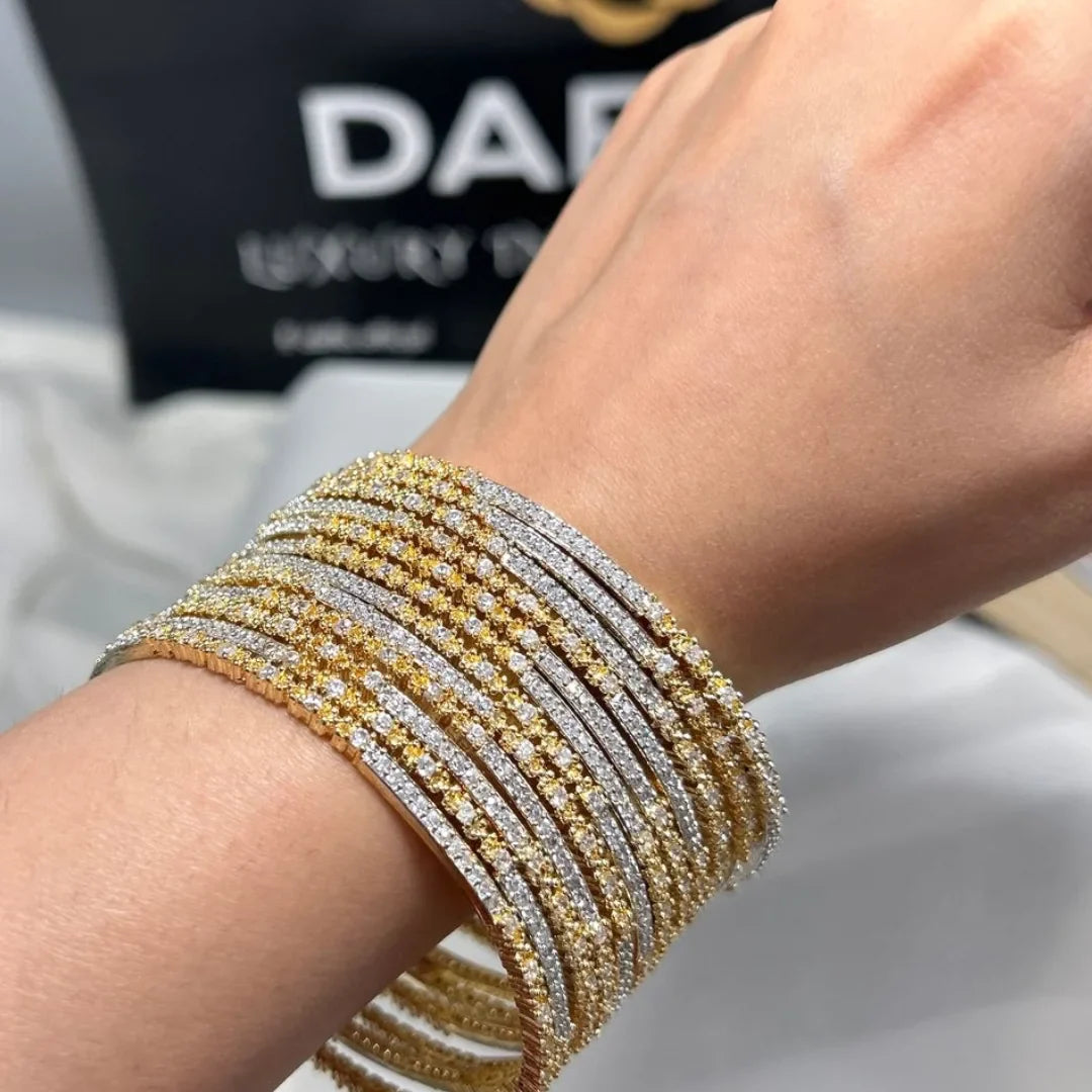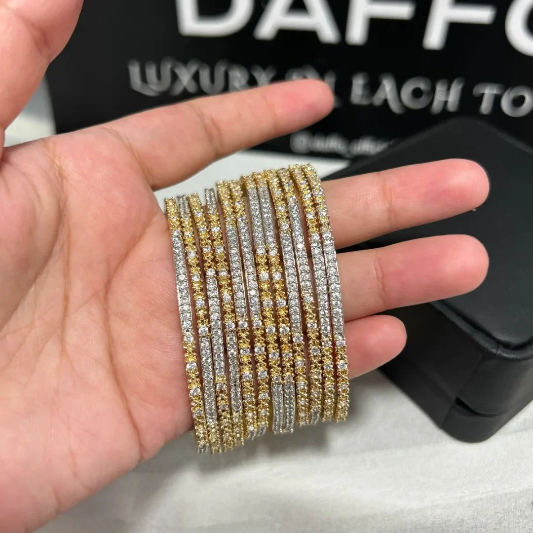 Add timeless elegance to your look with our One-Carat Double Tone Bangles Set. This 12-piece collection blends silver and golden tones for a versatile style that pairs beautifully with any outfit — from casual chic to festive glam.